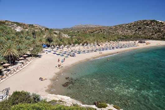 On Crete’s isolated east coast, the lovely golden sands of Palm Beach (Finikodasos) are backed by a dense grove of towering palm trees. According to local legend, the palms grew from date stones washed ashore from Saracen ships in the ninth century. Whatever their origin, the palms certainly flourish in Crete’s balmy Mediterranean climate, with relatively mild and wet winters and completely dry summers of subtropical heat. The beach is lined with blue sun beds and straw umbrellas, and tourists will find a café and basic water sports facilities here. To the south end of the beach, a rocky outcrop with a viewing platform affords fine views down onto the shore and is ideal for taking photos. The nearest sizeable resort is Áyios Nikólaos 96 kilometers away on the north coast.
